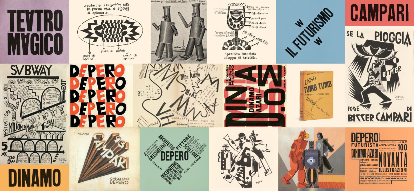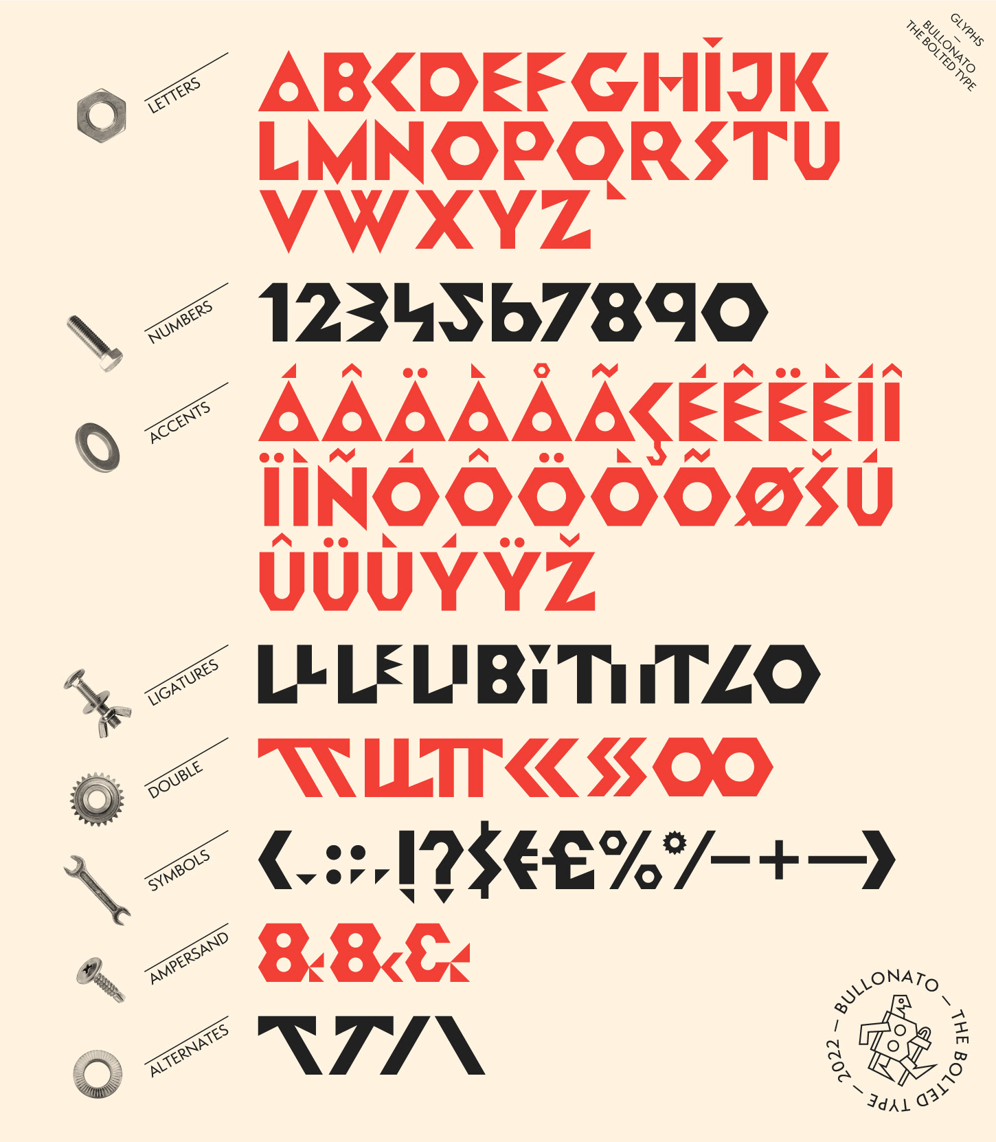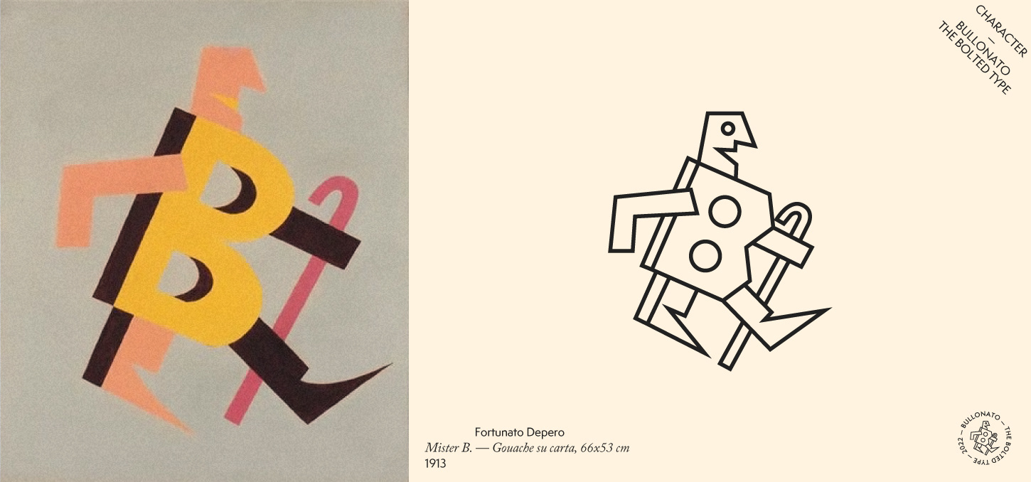 The bolt, the emblematic symbol of Depero’s work, becomes the matrix of this new typeface from which its glyphs take shape. Mechanical and artisanal, Bullonato echoes the typography Depero elaborated in his most famous advertisements. Its set of letters, numbers, accents, ligatures, stylistic alternatives, doubles, etc. offers, to those who use it, the maximum futurist charge and freedom of expression.
