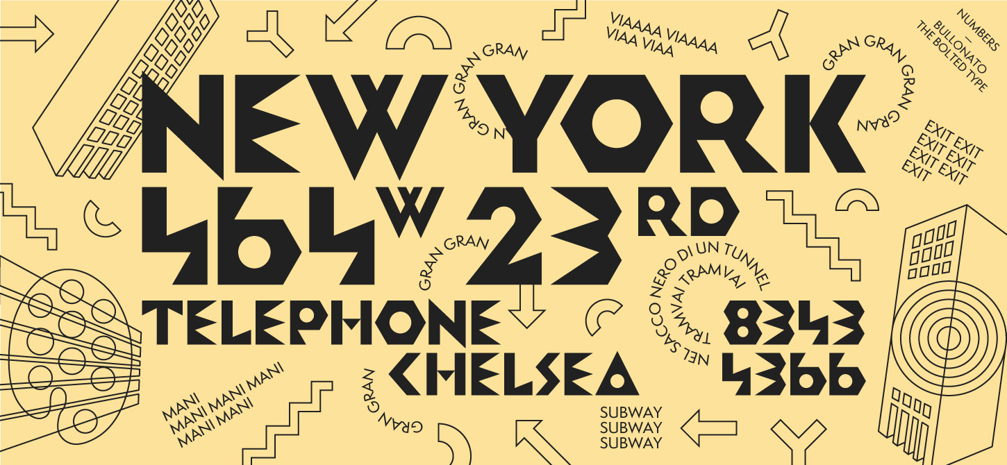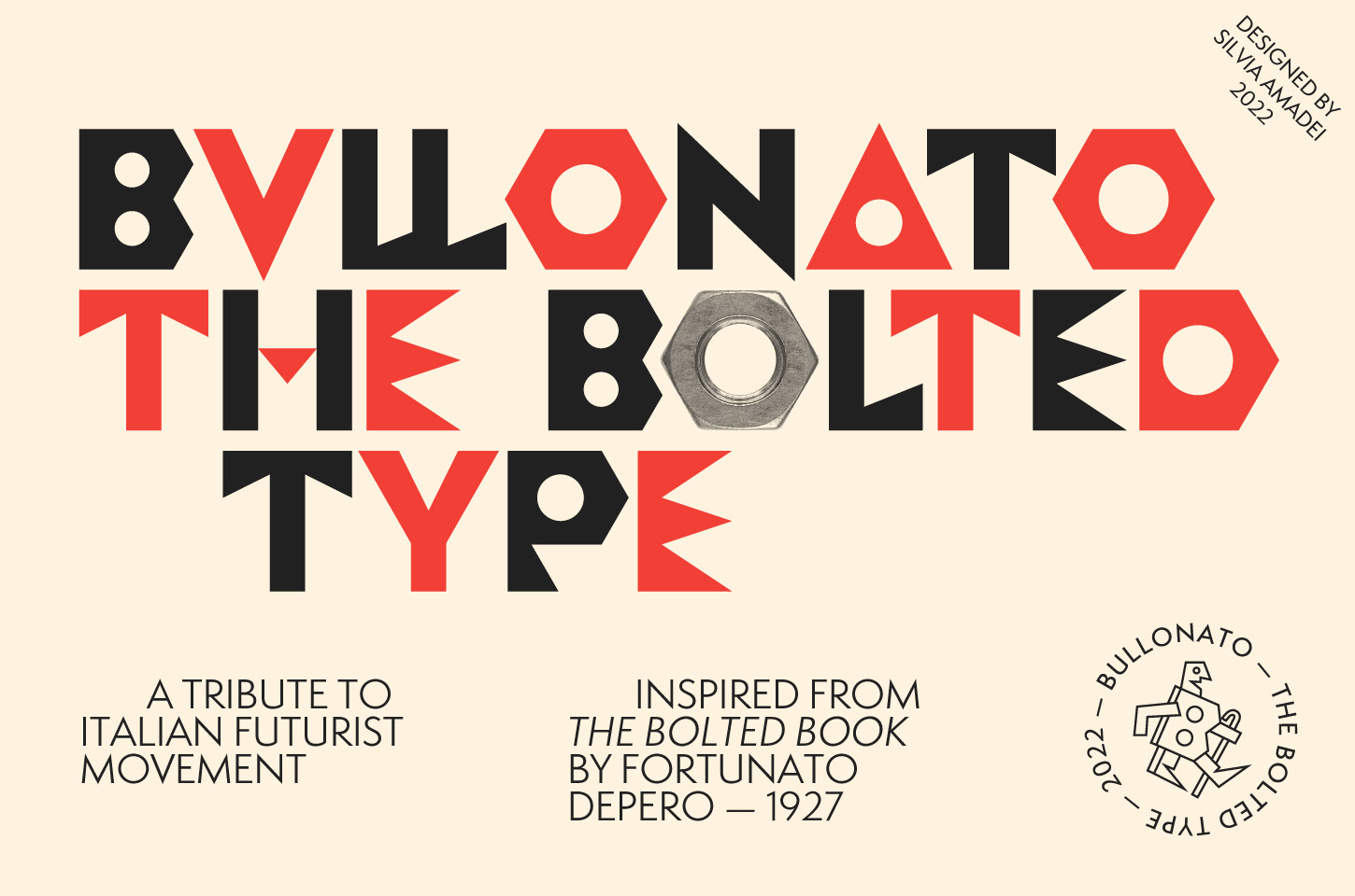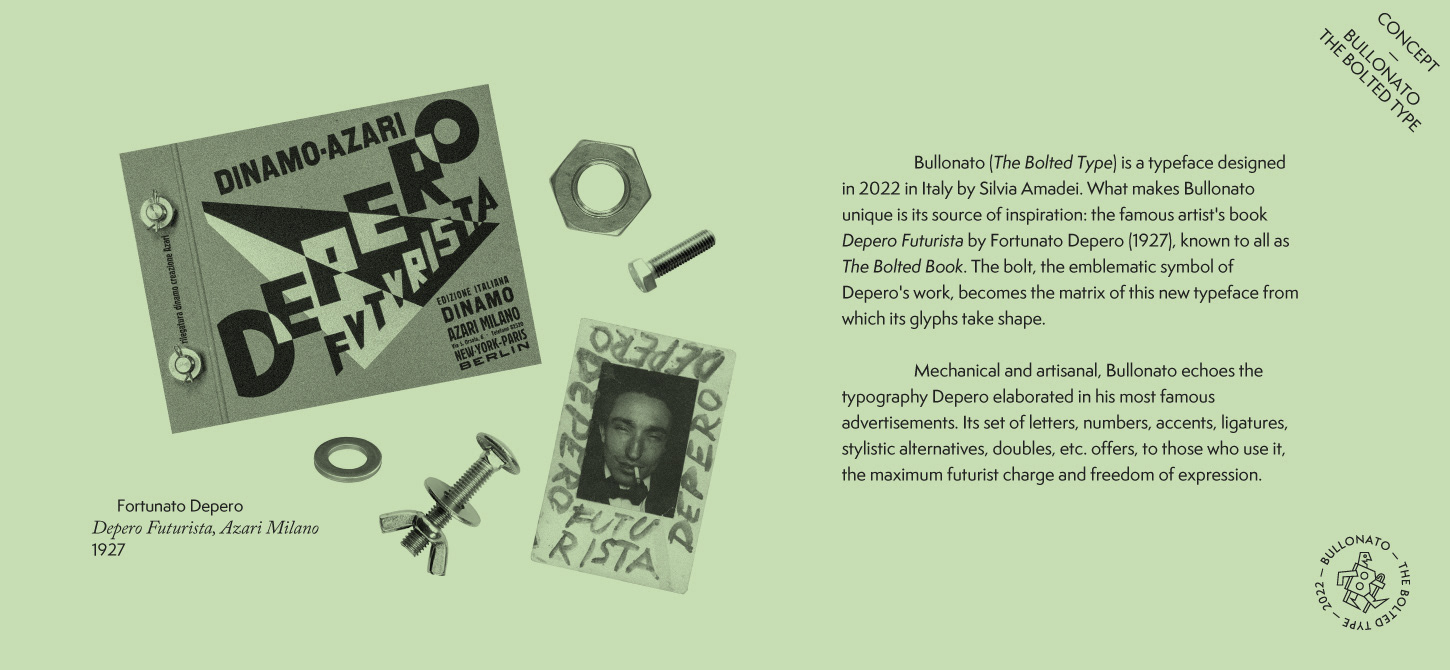 Bullonato (The Bolted Type) is a typeface in the Italian modernist style. What makes Bullonato unique is its source of inspiration: the famous artist’s book Depero Futurista by Fortunato Depero (1927), known to all as Libro Bullonato (The Bolted Book).