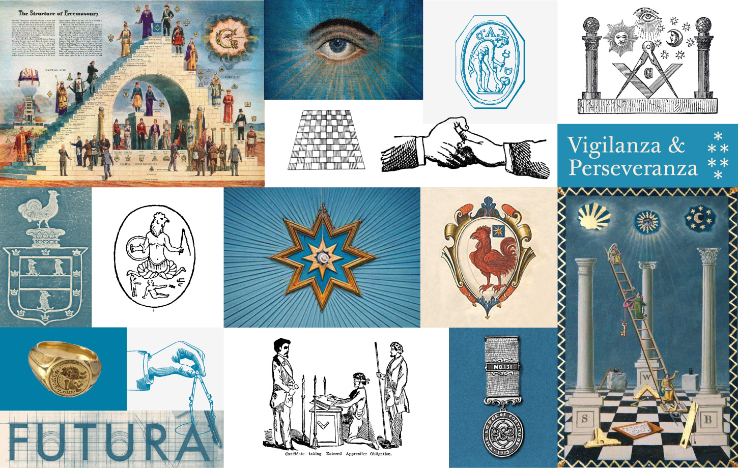 The dominant use of blue throughout the brand identity refers to Blue Freemasonry, namely the first three fundamental degrees of Masonic initiation: Apprentice, Fellow Craft, and Master Mason.