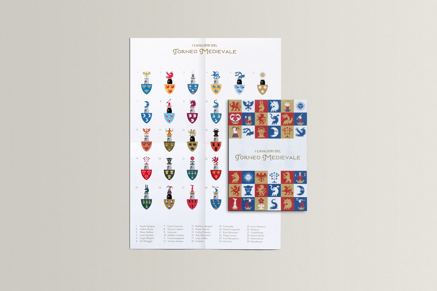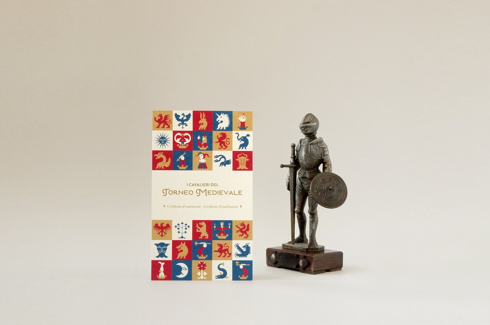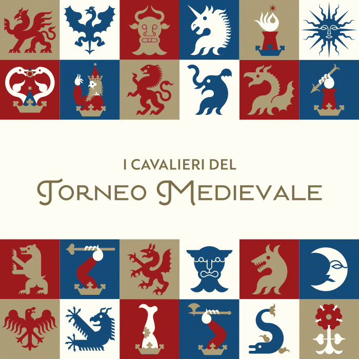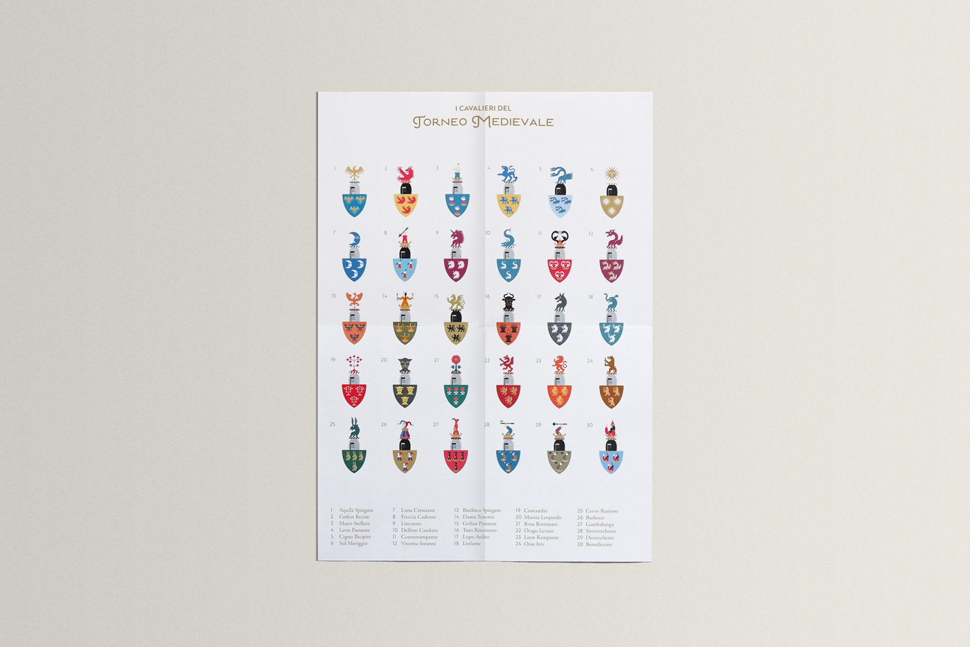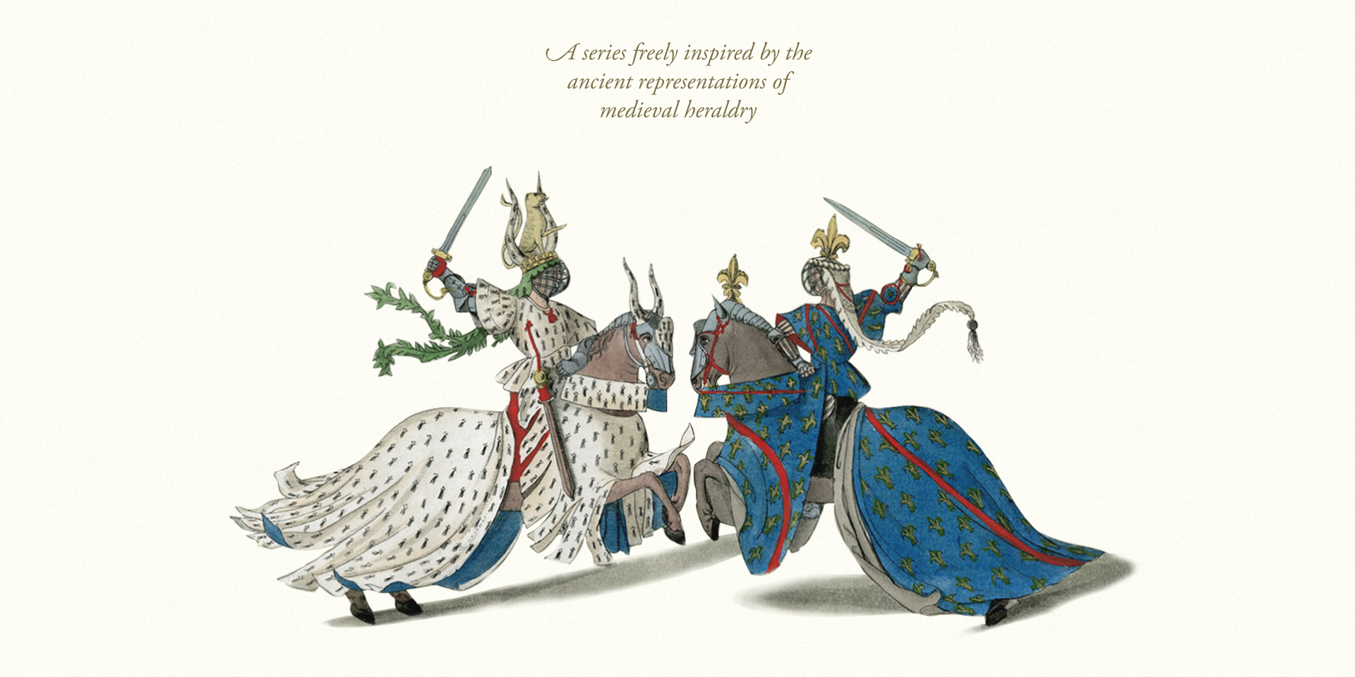 Thirty are the knights and thirty are the heraldry and crests designed for each of them: animals, human and chimeric figures, plants and inanimate objects, combined with bright colors, are the identifying symbols that tell the personality of each knight. Thirty are also the names of the knights, which were conceived by drawing inspiration from the lexicon of blazon.
